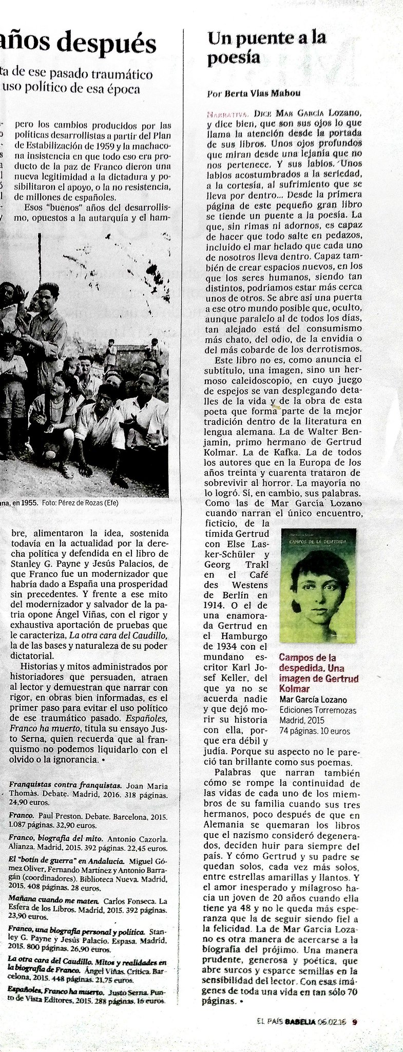 2.Lugar del sacrificio, toma mis ojos.Es lenta la hora de morir,la emboscadura brevede la luz,la fría fábricadonde tuve mi muerte.3.Su pelo, dice Bataille, seco y confuso,parecía unas alas,su pelo era unas alas,Albert Camus amó su mente,dijo de ella que era el único espíritu libre de sutiempo.